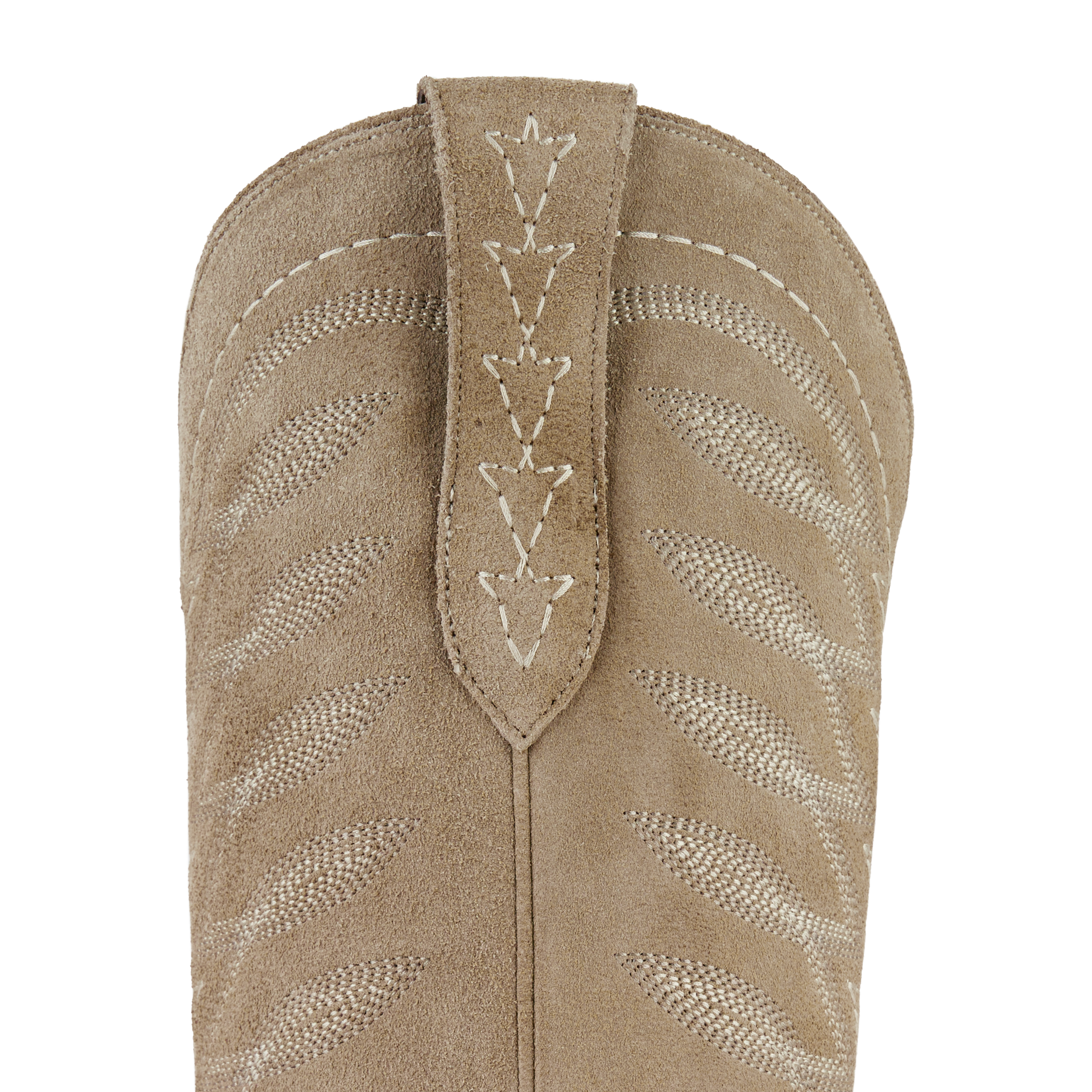 Embrace the allure of our high-fashion western boot this fall, adorned with a squash blossom motif. Luxe suede leather and detailed stitch patterns define its essence. Elegantly merging fashion's edge with western tradition, its enduring silhouette is painted in the season's coveted hues