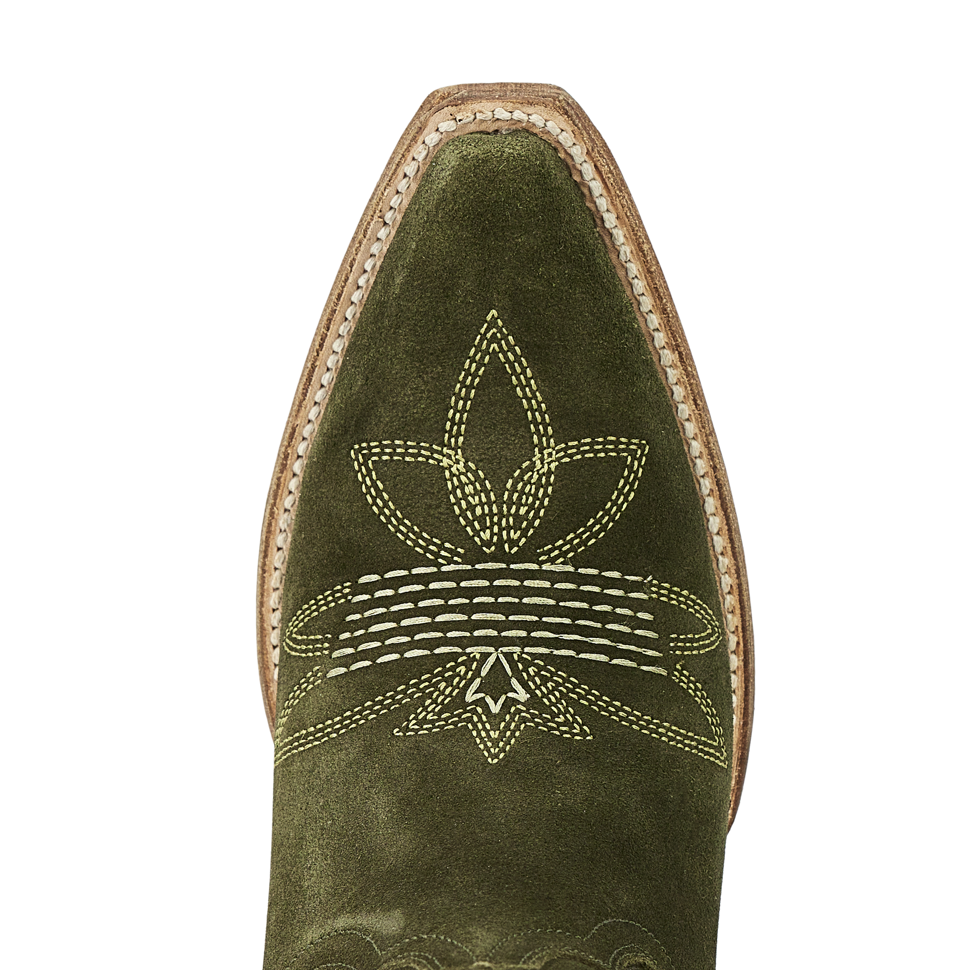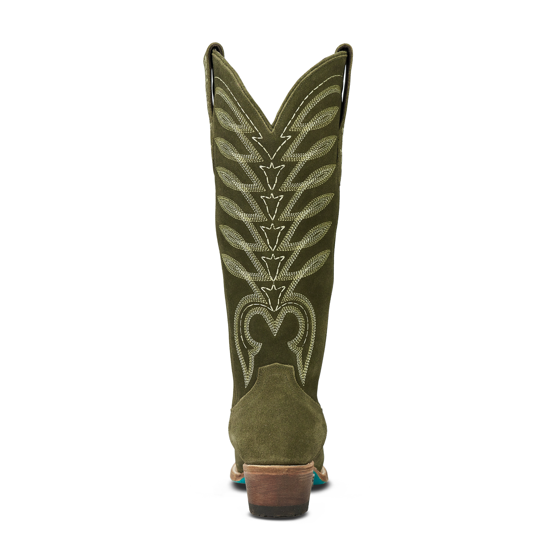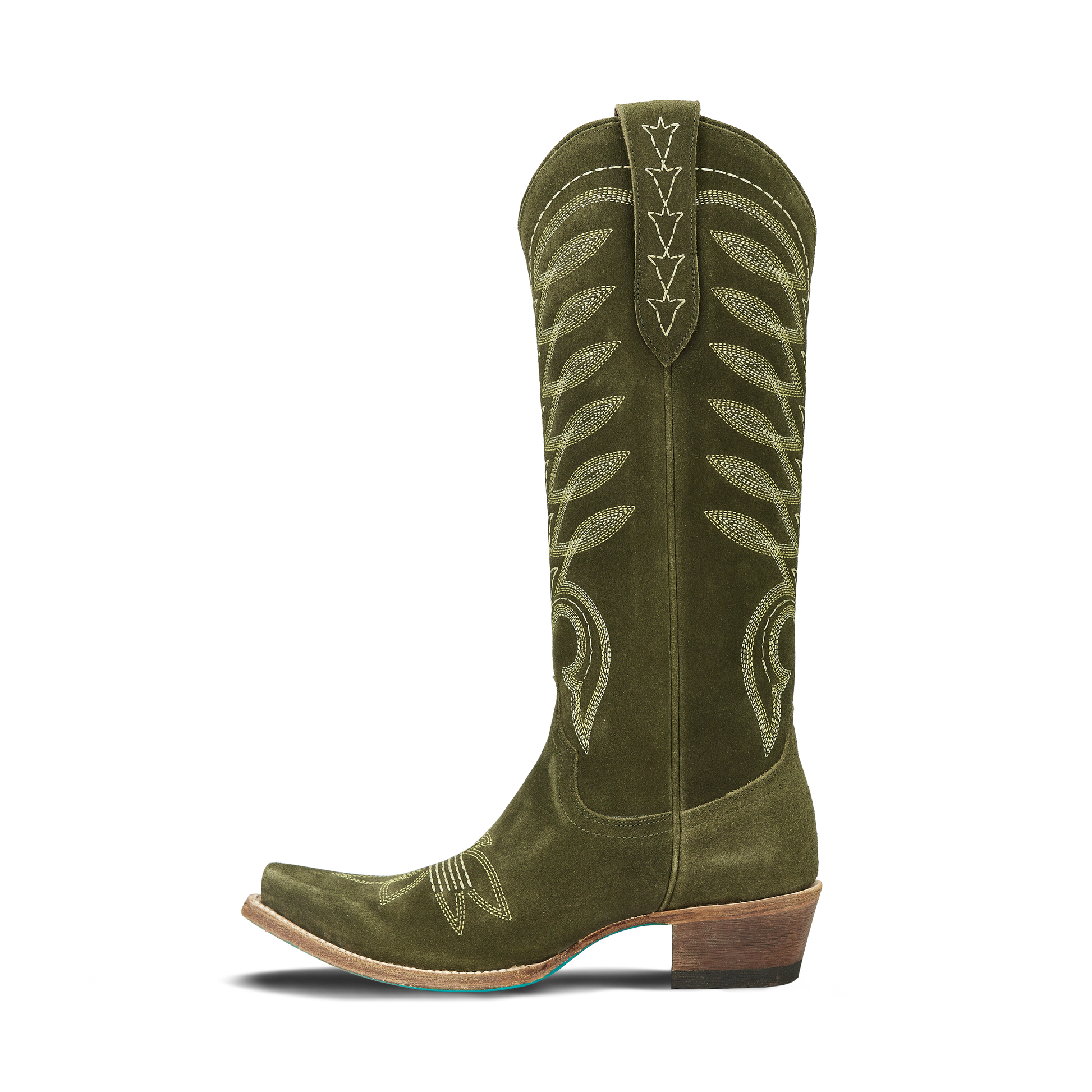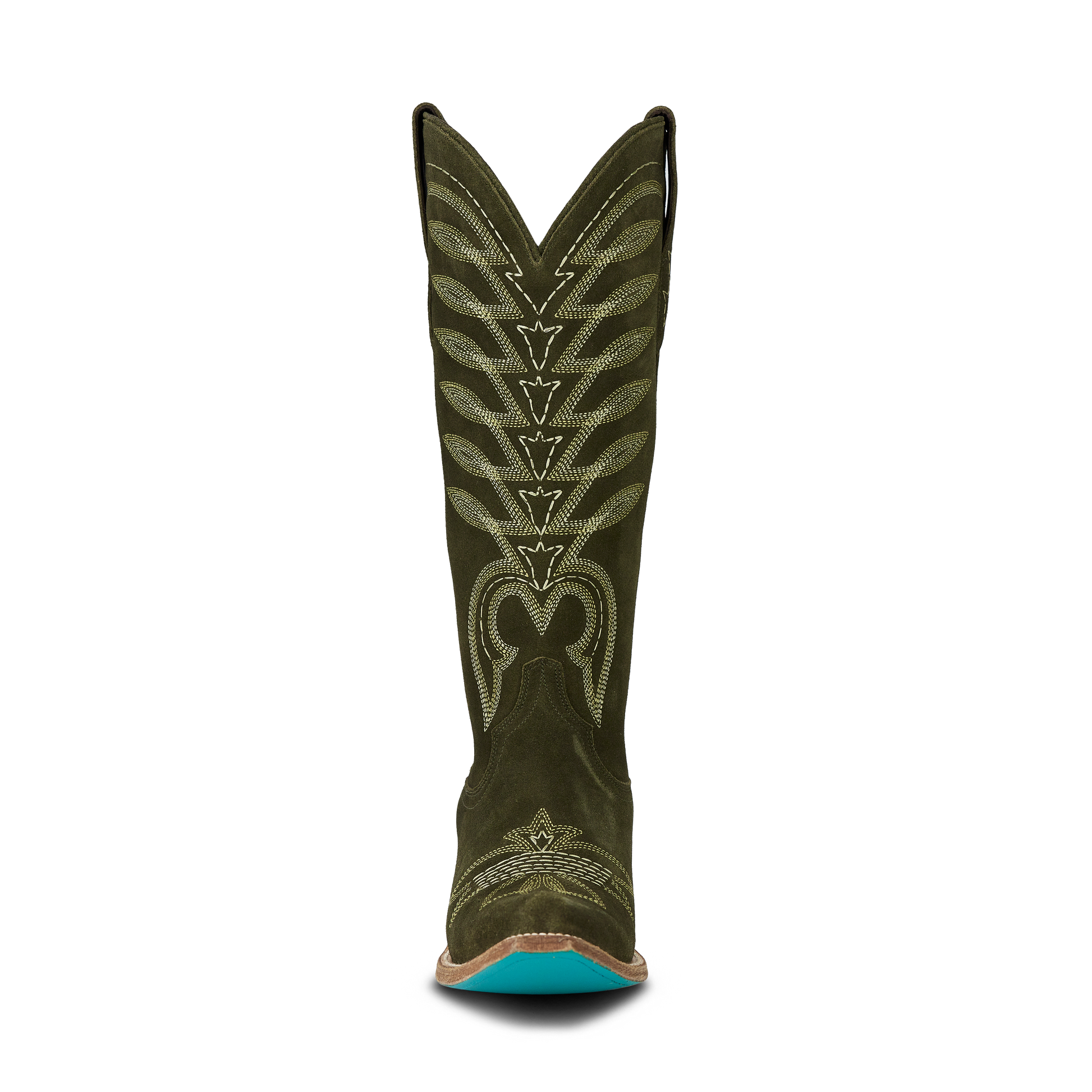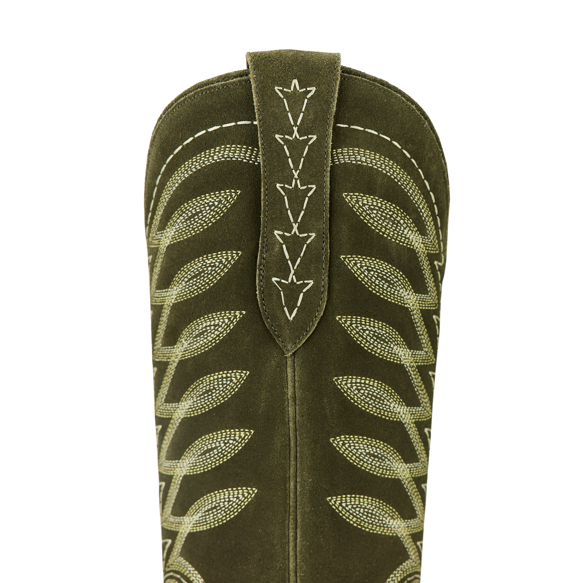 Revel in the elegance of our autumn essential cowboy boot, adorned with a squash blossom motif. Crafted from sumptuous suede leather and highlighted with intricate stitching. This tall statement piece seamlessly melds high fashion with western heritage, showcasing an ageless silhouette in contemporary shades.