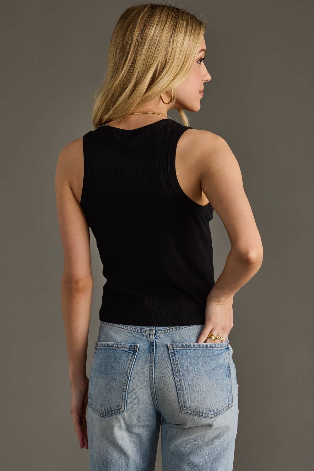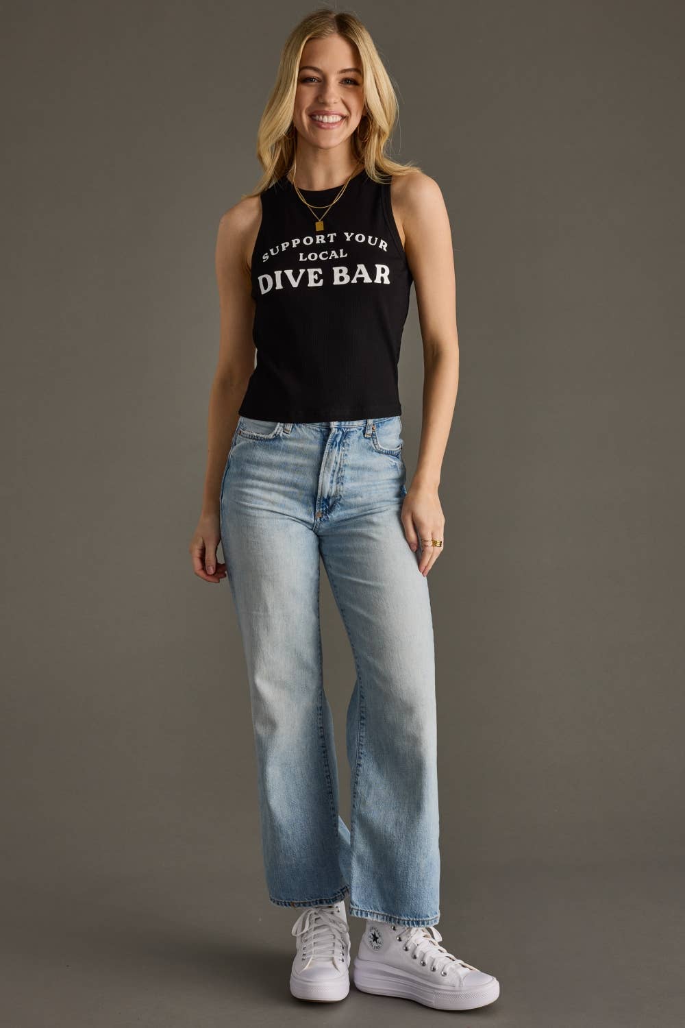 Black ribbed tank top with white "Support your local dive bar" text on front. Wear alone or under a cute flannel for fall and winter.