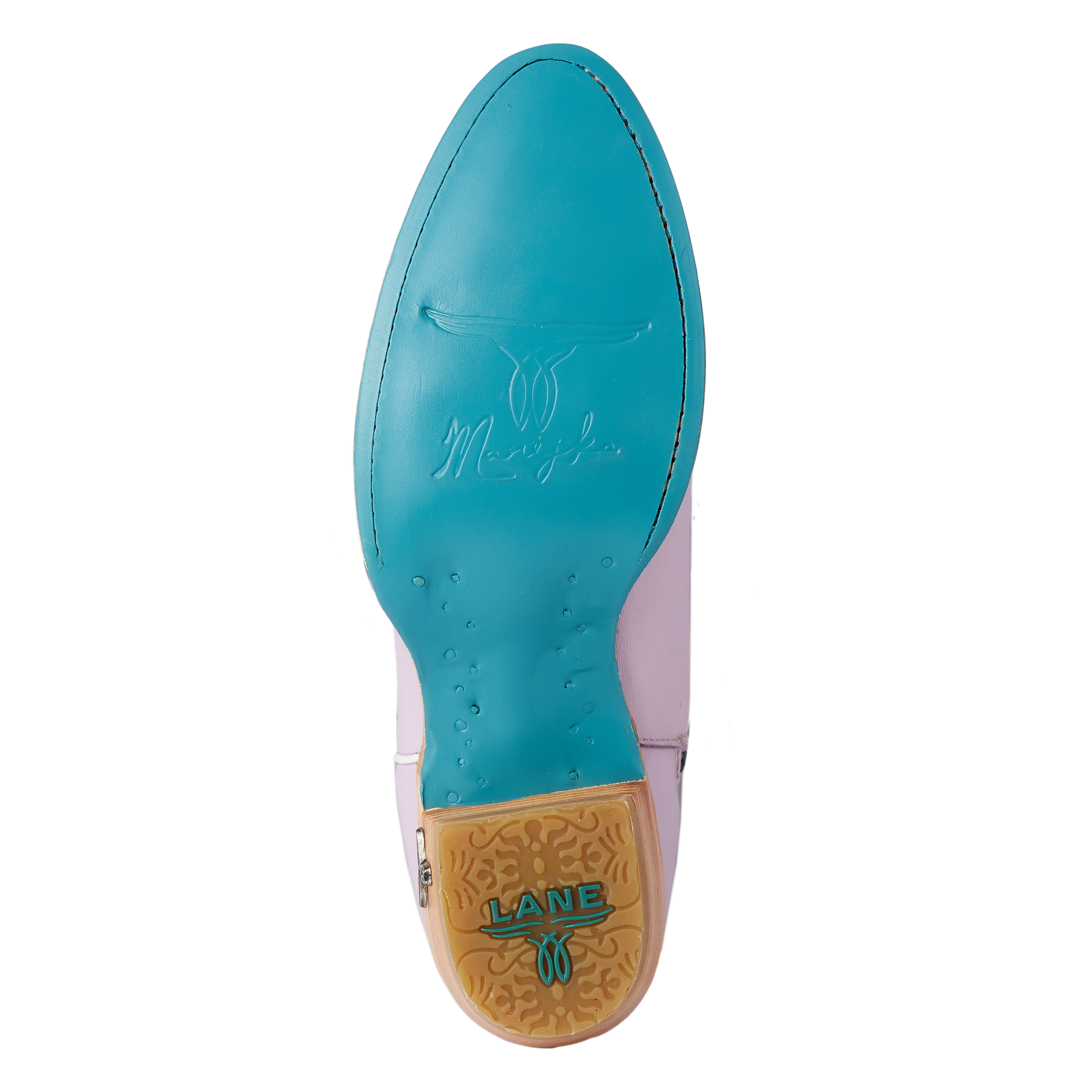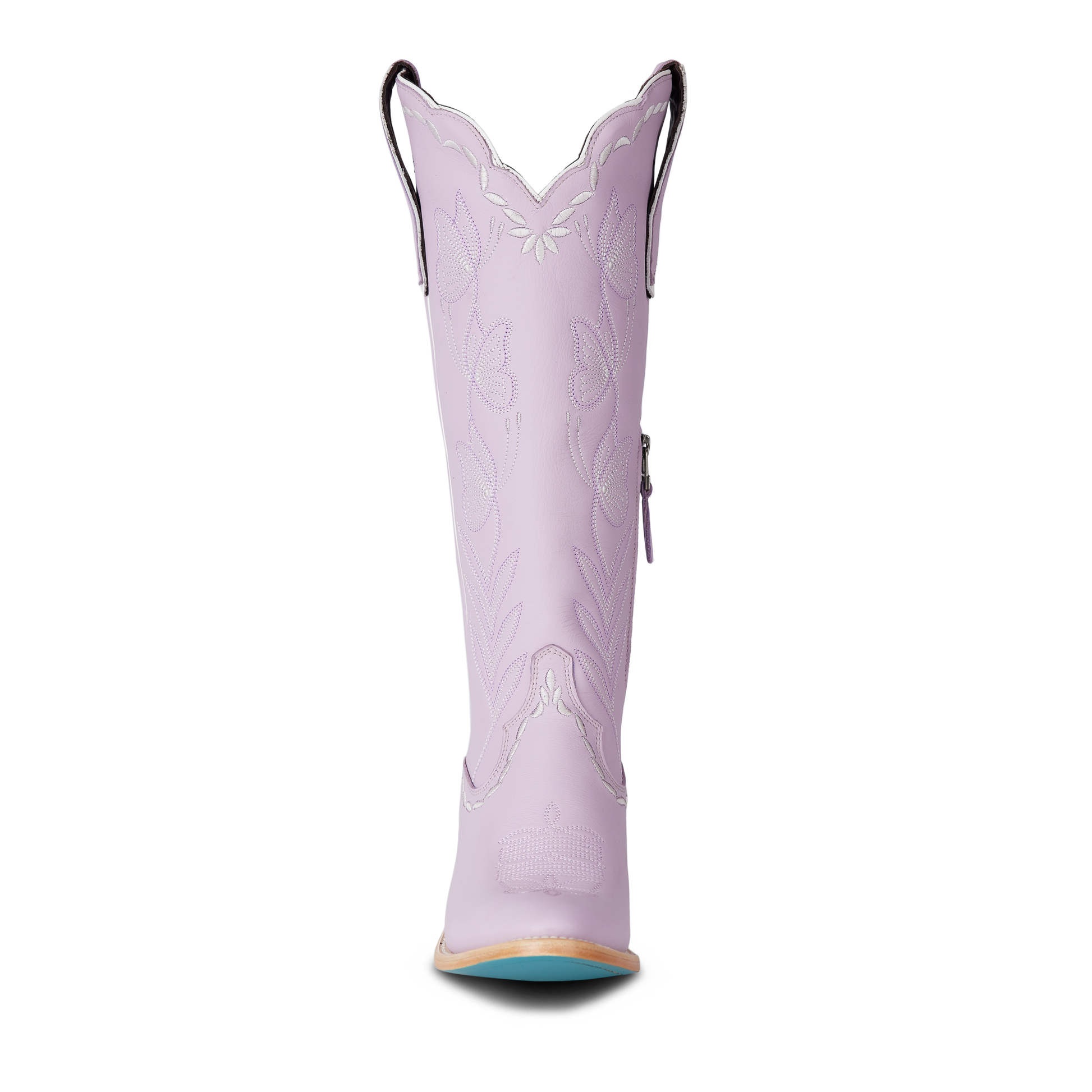 The boot features lovely lavender leather, scalloping, delicate butterfly stitching, and a whimsical, floral-inspired edging, and the Lane signature blue bottom.