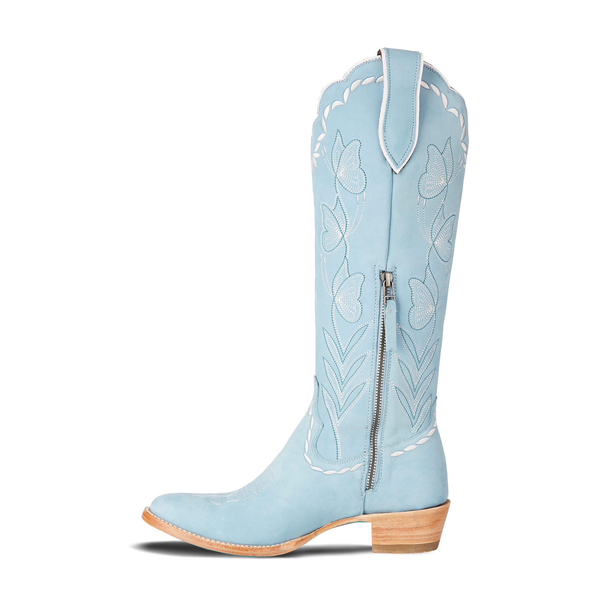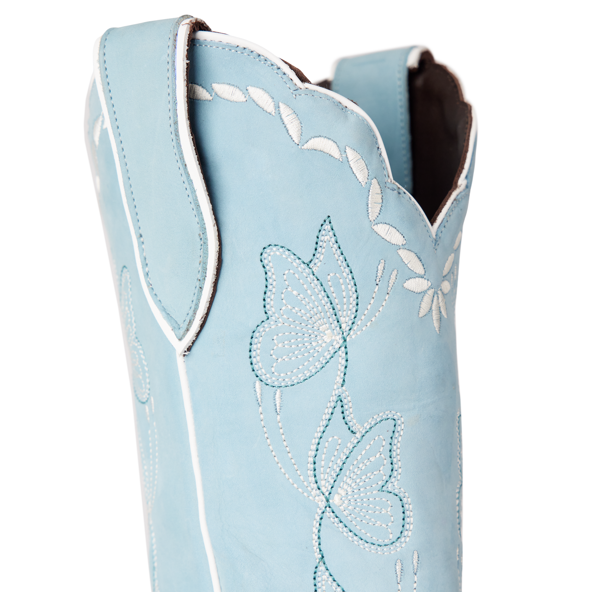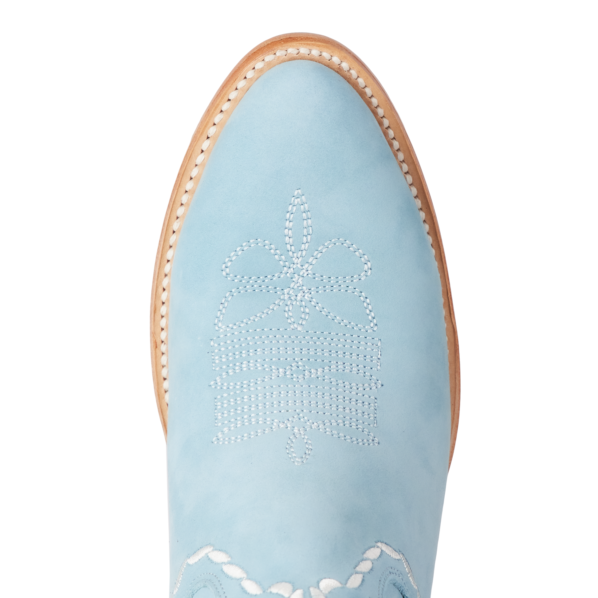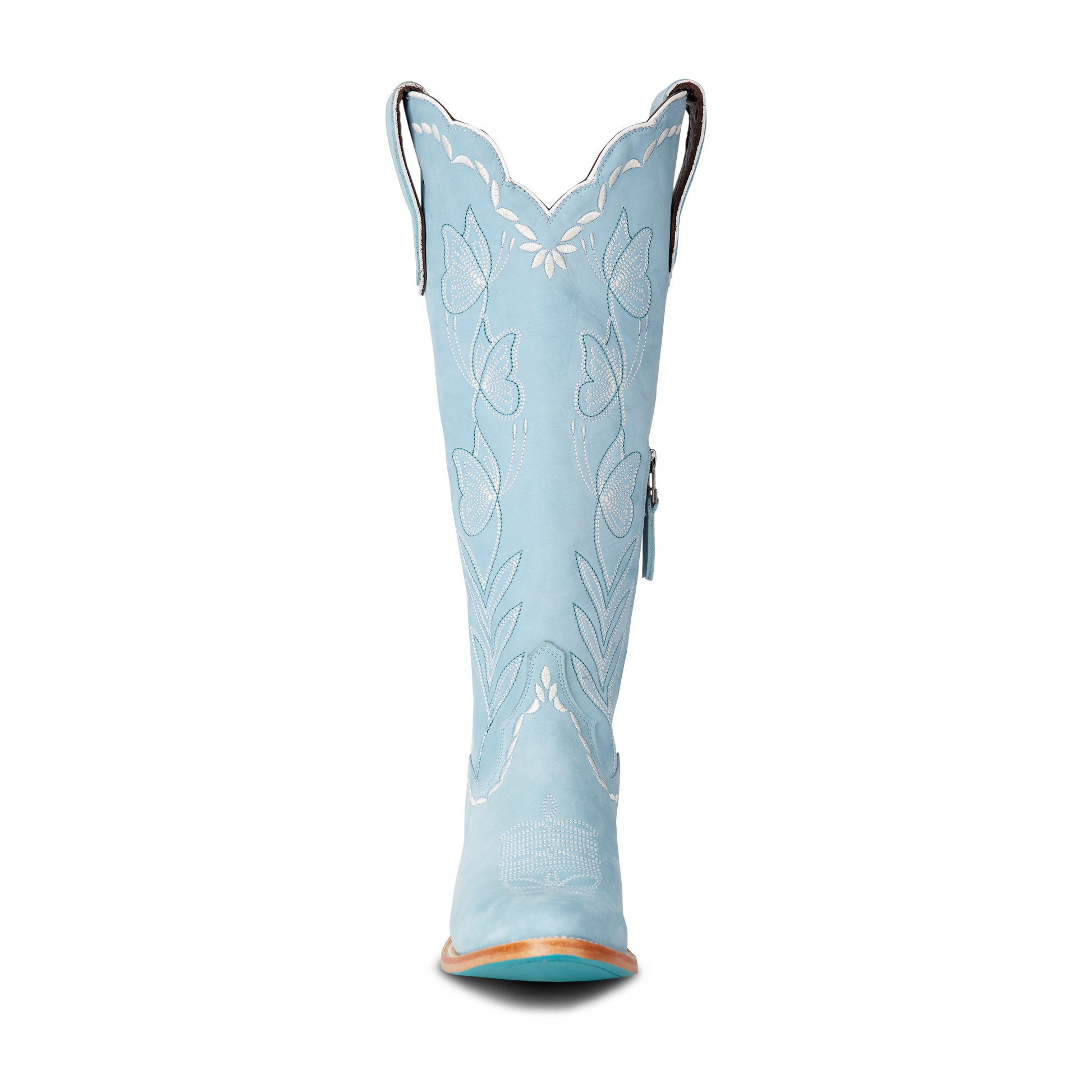 The boot features lovely powder blue leather, scalloping, delicate butterfly stitching, and a whimsical, floral-inspired edging, and the Lane signature blue bottom.