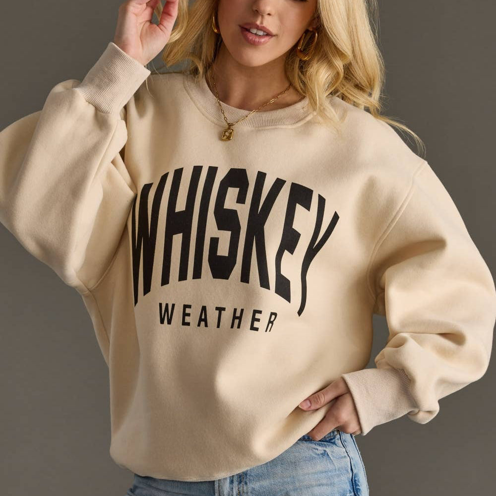 Tan Whiskey Weather Sweatshirt. This soft sweatshirt is tan with black "Whiskey Weather" text on the front.