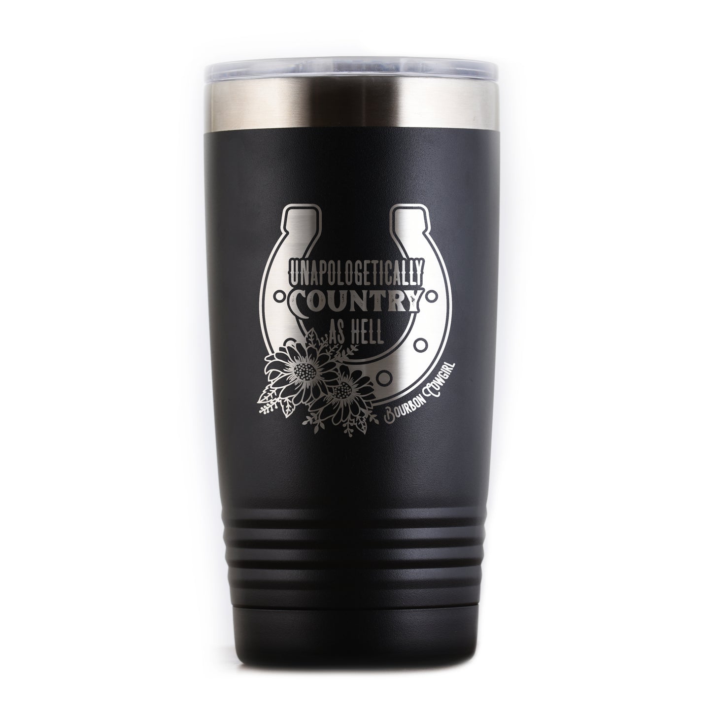 Unapologetically Country as Hell Travel Tumbler is for the farmer's daughter, the country girl, the rodeo or barrel racing babe who won't apologize for being her badass self. The tomboys who weren't afraid to get dirty and who are the proudest of country girls will love this gorgeous horseshoe and flower design. A funny gift for your best friends and all the girls as you head to a birthday party, girl’s night out or a weekend getaway with your tribe. Get a different design or color for each friend and give her a gift she can use daily and cherish always.