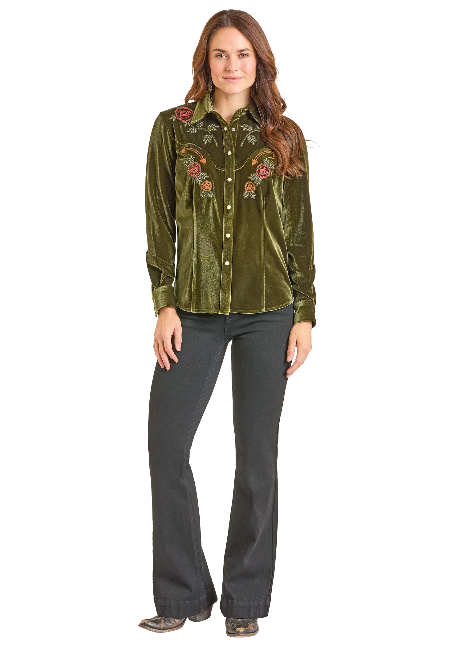 Velvet Retro Snap Shirt by Panhandle. Shop western style blouses at Bourbon Cowgirl. This beautifully embroidered velvet shirt with a western cut and pearl snaps is a cowgirl must have!