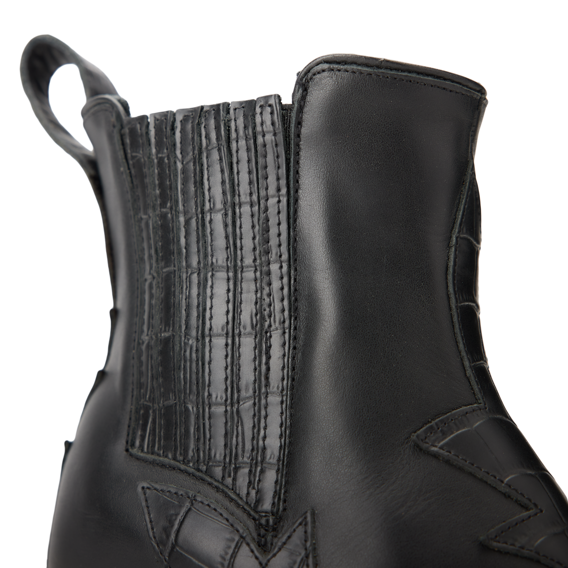 Breathe new life into a classic with this western-inspired Chelsea Bootie in Jet Black. Designed with a sleek, leather-covered elastic goring that frames the sidewall, this boot delivers effortless style and an ultra-flattering silhouette. The flame-stitched overlay motif brings an edge to the timeless Chelsea shape, with striking flame details running up the front and back—doubling as a pull tab for easy wear.