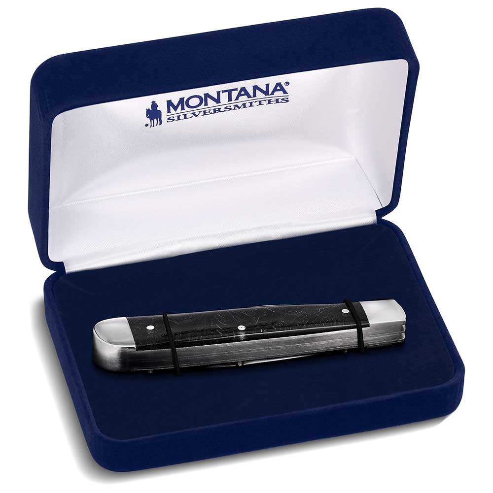 Be prepared for any adventure with the Western Plains Trapper Knife. This pocketknife features two easily accessible blades. The handle is jet black, with a Western tooling design creating a clean look. The Montana Silversmiths logo Can be seen at the end of the handle. Be the person who is prepared for any task with a convenient and stylish pocketknife.